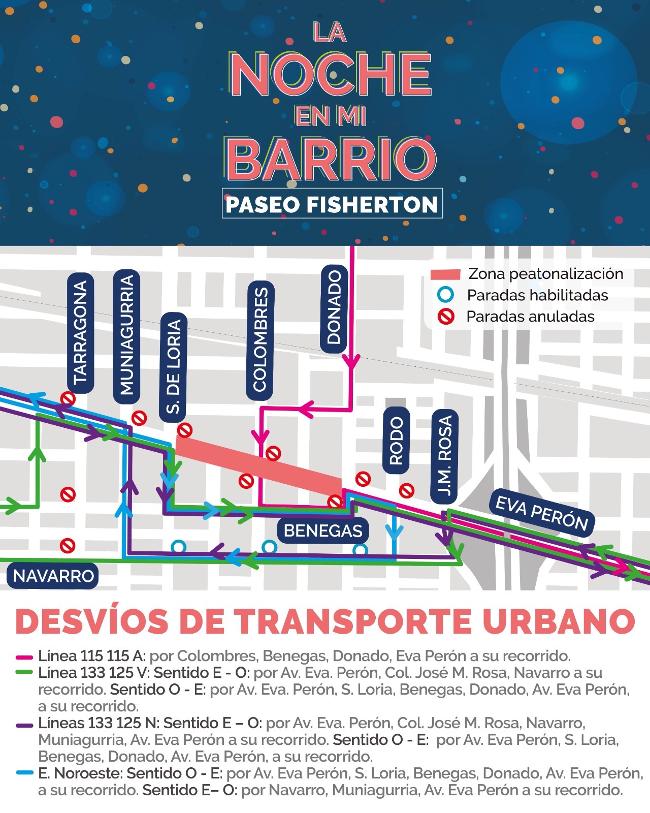 De su recorrido por José Colombres, Benegas, Donado, Eva Perón a su recorrido.